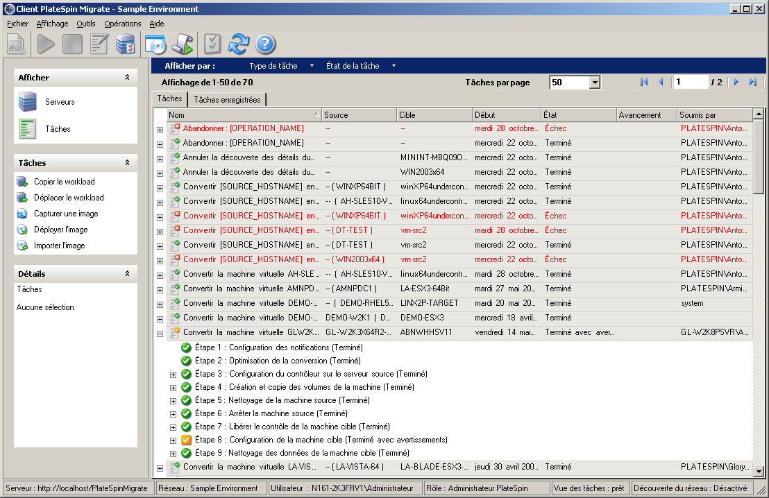 Vue des tâches : la vue des tâches affiche toutes les tâches, notamment de découverte, de migration et de capture d'image. Reportez-vous à la Section 3.2.3, Vue Tâches.