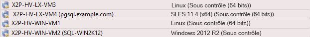 La Figure 3-2 fournit un exemple de noms d'hôte X2P des workloads cibles avec et sans système d'exploitation. Les workloads X2P-HV-LX-VM3 et X2P-HV-WIN-VM1 n'ont pas de système d'exploitation sous-jacent. Les informations du LRD s'affichent en tant que système d'exploitation.