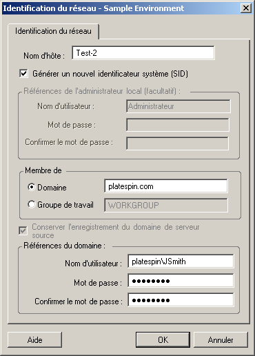 Nom d'hôte : spécifiez le nom d'hôte souhaité pour la machine cible. Générer un nouveau SID : lorsque cette option est sélectionnée, un nouvel identificateur système (System Identifier - SID) est assigné au workload cible. Des informations d'identification sont requises uniquement pour Windows 2008 ; il doit s'agir des informations d'identification pour le compte d'administrateur local (intégré). Si ce compte a été localement renommé sur la source, spécifiez le nouveau nom. Membre de (Domaine/Groupe de travail) : sélectionnez l'option requise et entrez le nom du domaine ou du groupe de travail à assigner à la machine cible. Conserver l'enregistrement de domaine du serveur source : conserve l'enregistrement du domaine et préserve l'enregistrement du domaine du serveur source pendant la migration. Si vous désactivez cette option, le compte de domaine de la machine source est transféré vers la machine cible. Le serveur source semble toujours sur le domaine, mais ne dispose pas d'une connexion valide. Informations d'identification du domaine : si l'ordinateur cible doit faire partie d'un domaine, spécifiez des informations d'identification valides pour un compte utilisateur ayant l'autorisation d'ajouter des serveurs au domaine, comme un membre du groupe d'administrateurs du domaine ou du groupe d'administrateurs de l'entreprise. |