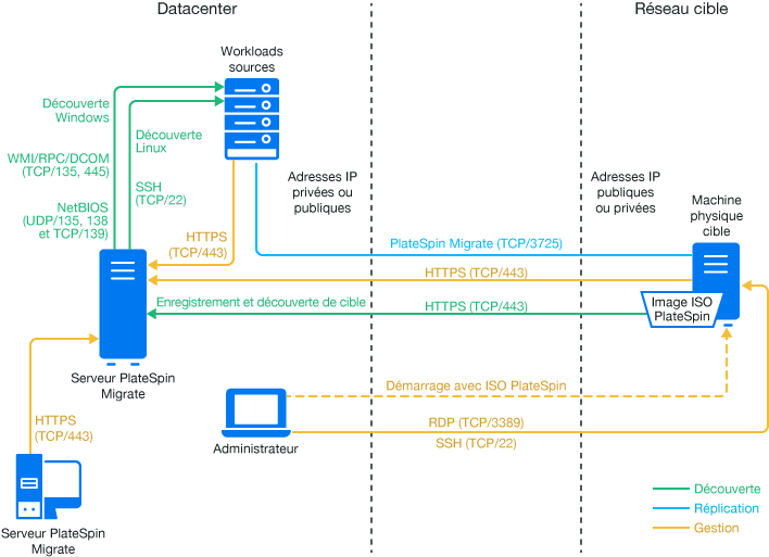 REMARQUE :la Figure 18-1 représente une découverte automatisée et les exigences réseau pour les workloads Windows et Linux. Vous pouvez également utiliser l'agent Migrate sur le workload source pour enregistrer le workload et envoyer les détails de son inventaire au serveur PlateSpin Migrate à l'aide de HTTPS (TCP/443). Reportez-vous aux sections Section 2.6.2, Conditions requises pour l'enregistrement de workloads et Section 22.7, Enregistrement de workloads et de découverte des détails avec l'agent Migrate.