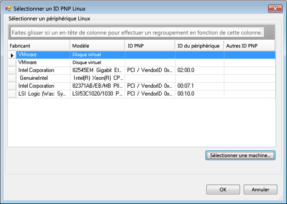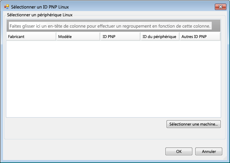 Cliquez sur Sélectionner en regard du champ d'ID PnP Linux pour ouvrir la boîte de dialogue de sélection de l'ID PnP Linux.