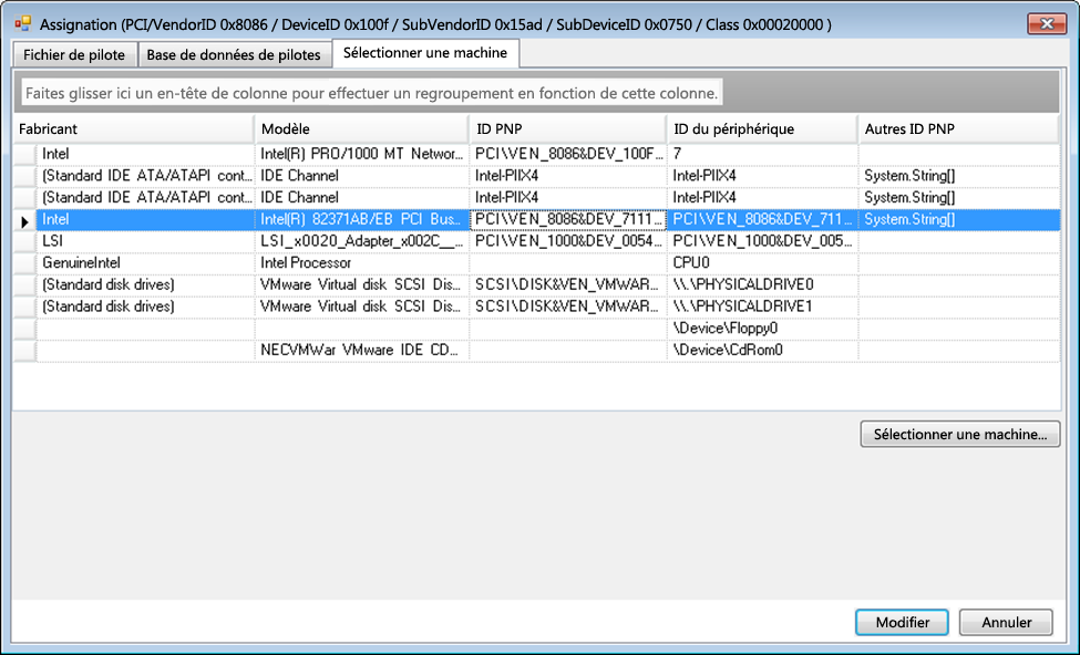 Sous l'onglet Sélectionner une machine, cliquez sur Sélectionner une machine, puis dans la liste des machines Windows découvertes à l'aide de la découverte dynamique, sélectionnez une machine, cliquez sur OK pour en afficher les périphériques, sélectionnez l'ID PnP de votre choix et cliquez enfin sur Modifier.