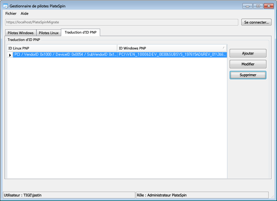 Dans la boîte de dialogue de création d'une assignation d'ID PNP, vérifiez que les ID PnP Linux et Windows corrects sont sélectionnés, puis cliquez sur OK pour afficher la page « Traduction d'ID PNP » du Gestionnaire de pilotes PlateSpin.