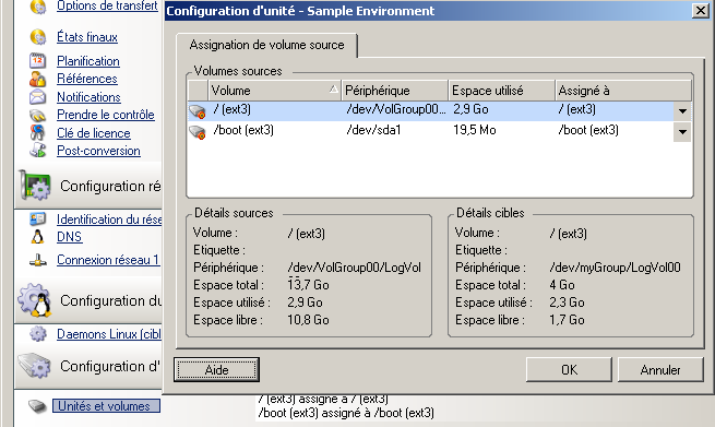 Assigné à : assignez chaque volume de la source à un volume existant sur la cible. |