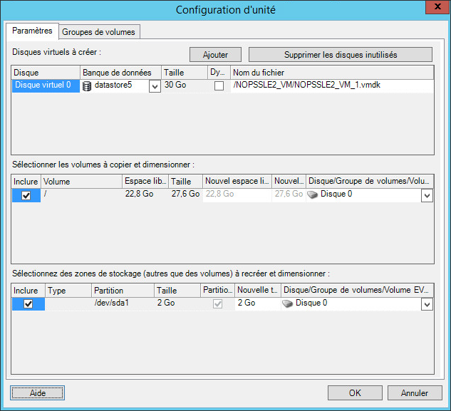 Ces paramètres permettent de sélectionner les volumes et les espaces sources autres que des volumes à copier et à dimensionner au cours de la migration. Si LVM est installé sur la source, un onglet Groupe de volumes vous propose les options correspondantes.