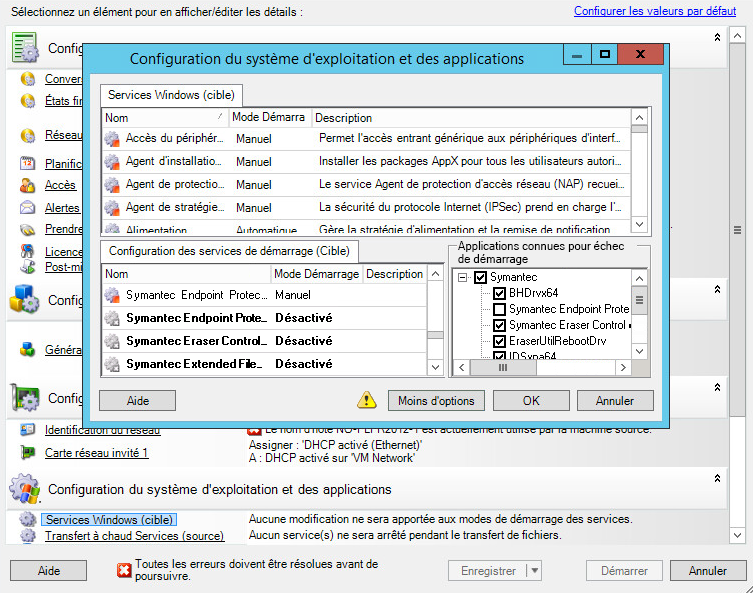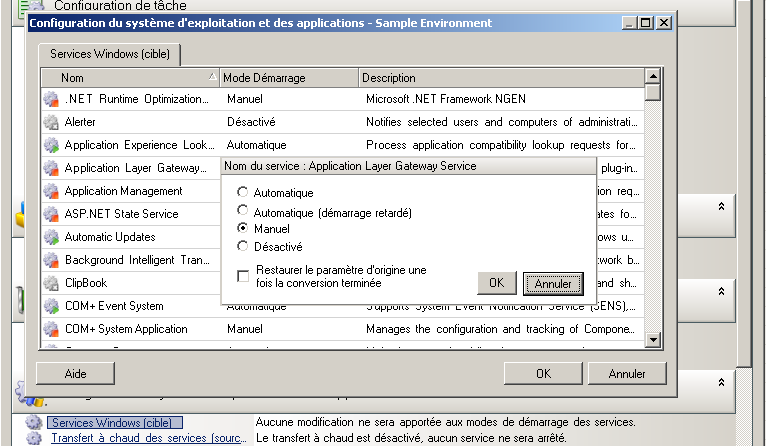 Dans la section Configuration du système d'exploitation et des applications de la fenêtre Tâche de migration, cliquez sur Services Windows (cible), puis sur un élément dans la colonne Mode Démarrage.