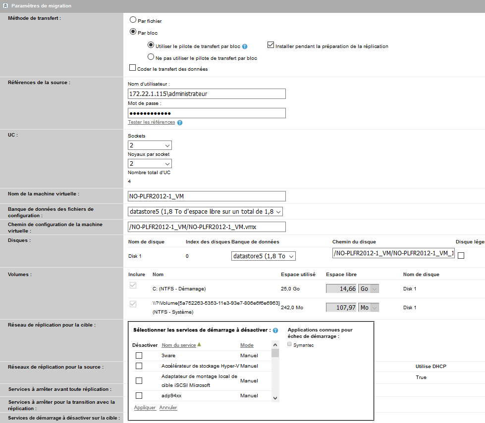 Sur la page Modifier les détails de la migration, accédez à Paramètres de Migration > Services de démarrage à désactiver sur la cible.