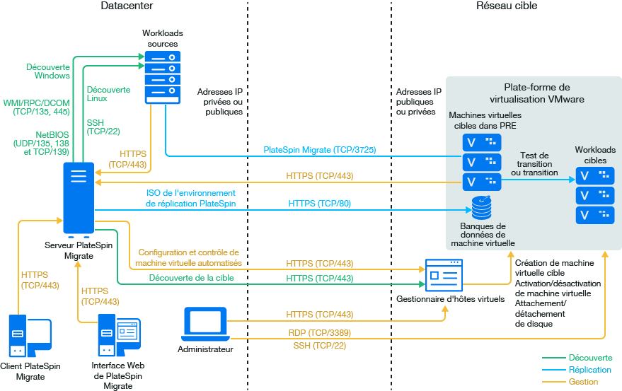 REMARQUE :la Figure 13-1 et la Figure 13-2 représentent une découverte automatisée et les exigences réseau pour les workloads Windows et Linux. Vous pouvez également utiliser l'agent Migrate sur le workload source pour enregistrer le workload et envoyer les détails de son inventaire au serveur PlateSpin Migrate à l'aide de HTTPS (TCP/443). Reportez-vous aux sections Section 2.6.2, Conditions requises pour l'enregistrement de workloads et Section 22.7, Enregistrement de workloads et de découverte des détails avec l'agent Migrate.