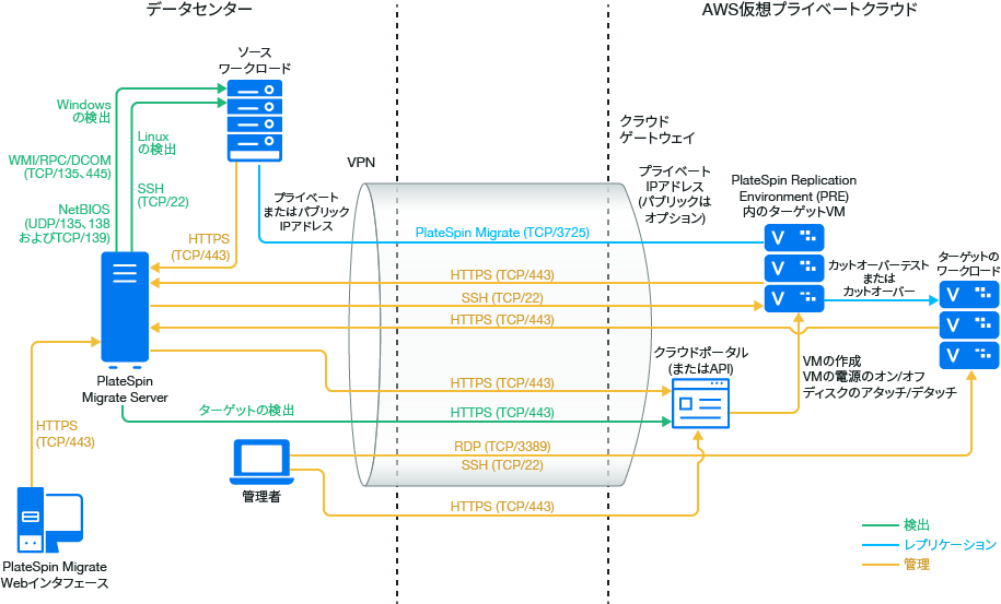 メモ:図 8-1は、自動検出およびWindowsワークロードとLinuxワークロードのネットワーク要件を示しています。別の方法として、ソースワークロード上でMigrate Agentを使用してワークロードを登録し、そのインベントリ詳細をHTTPS (TCP/443)経由でPlateSpin Migrateサーバに送信することができます。詳細については、セクション 2.6.2, ワークロード登録の要件を参照してください。