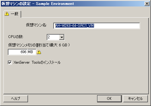 [仮想マシンの設定]ダイアログのホスト固有のターゲットVM環境設定オプションについては、ターゲットVM環境設定: Citrix XenServerを参照してください。