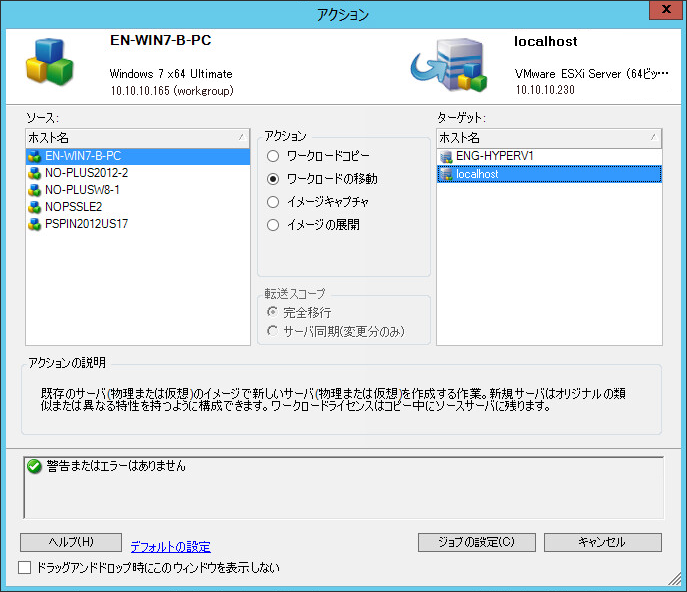 ソースからターゲットに転送されるワークロードデータの範囲を完全移行またはサーバ同期(変更のみ)として指定します。 |