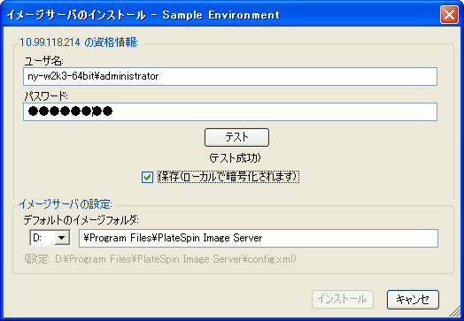 選択したホストの管理者の資格情報を入力し、イメージファイル用に任意のディレクトリを指定します。