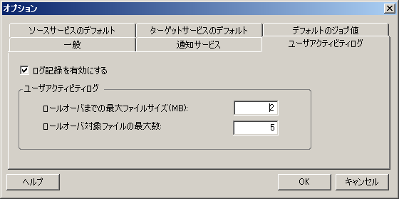 PlateSpin Migrate Clientでは、ユーザアクテビティログをオフまたはオン(デフォルト)にすることができます。ユーザアクテビティログファイルの最大許容サイズおよびユーザアクテビティログで保持するロールオーバーファイルの数を設定できます。