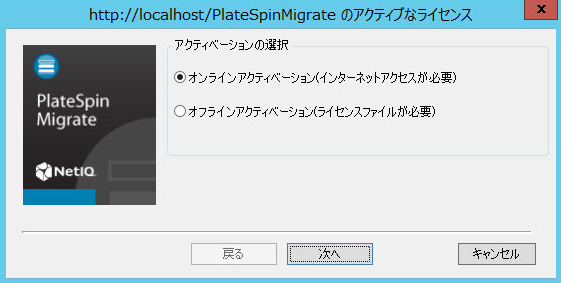 インストール後初めてPlateSpin Migrate Clientを起動する際は、ライセンスアクティベーションウィザードが開き、製品ライセンスを有効にするよう促すメッセージが表示されます。