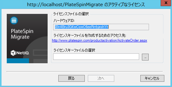 ライセンスウィザードで、PlateSpin Migrateライセンスファイルへの完全パスを入力するか、またはライセンスファイルを参照して選択してから、次へをクリックします。