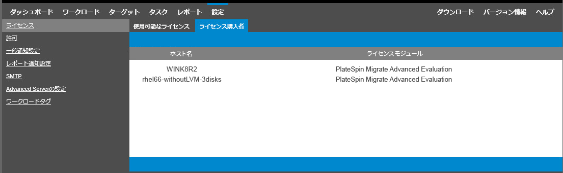 PlateSpin Migrate Webインタフェースで、設定]>[ライセンス]>[ライセンス購入者の順にクリックして、ワークロードのライセンスの割り当てを示します。