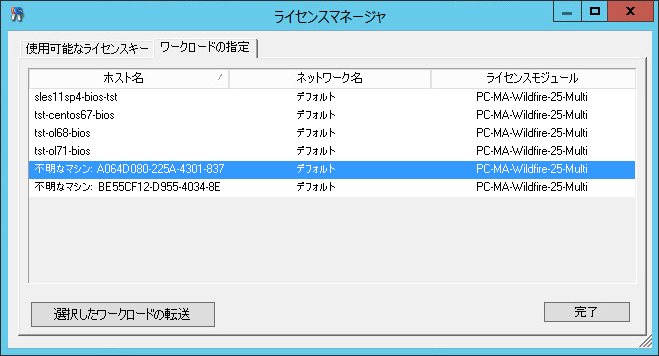 ライセンスマネージャのワークロードの指定タブで、必要なワークロードを選択し選択したワークロードの転送をクリックします。