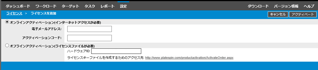 オンラインアクティベーションでは、PlateSpin Migrate Webインタフェースがインターネットにアクセスできることが必要です。