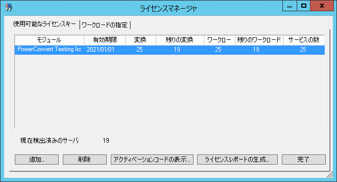 [ライセンス]タブでは、ライセンス名(モジュール)とともに、そのアクティベーションコード、有効期限、およびワークロードマイグレーションのエンタイトルメント数(使用可能なワークロードライセンスの数、ワークロードライセンスの使用数、ワークロードライセンスの残数、使用可能な変換数、変換の使用数、残りの変換数)が表示されます。