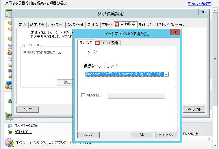 マイグレーションジョブの中で定義されたターゲットのマイグレーション後のネットワーク設定は、マイグレーションの完了後にターゲットのネットワーク環境設定を制御します。これは、物理および仮想のネットワークインタフェース両方に適用されます。