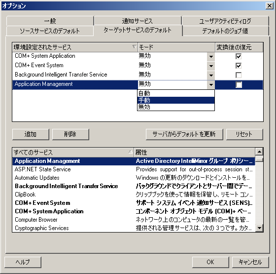 サービスの設定セクション: サービスおよびそれらのターゲット起動モードをリストします。選択したモードをマイグレーション時に使用するには、変換後の復元チェックボックスを選択します。すると、マイグレーション完了後、ソースと一致するようにサービスが復元され、ターゲットマシンが実行可能状態になります。 すべてのサービスセクション: 検出されたすべてのマシン上の固有のサービスをリストします。追加をクリックして、サービスを上側のセクションに追加します。モードドロップダウンリストを使用して、ターゲットのサービスステートを選択します。これは、ジョブの設定ステップ中に設定されます。 削除: サービスを削除します。 リセット: 上側のセクションの内容をクリアします。ターゲット内のすべてのサービスのモードが、ソース内のモードに一致します。 |