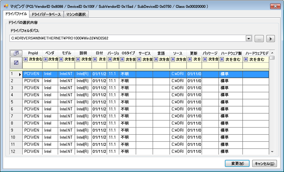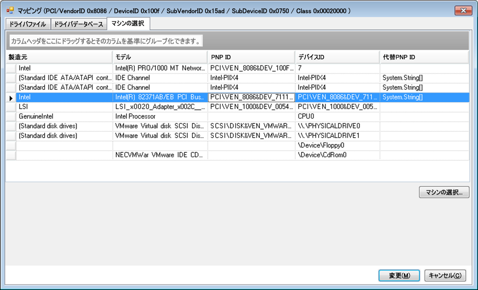 ドライバファイルタブで、Windowsドライバファイル(つまり、*inf拡張子のファイル)を参照して選択し、目的のPnP IDを選択して、変更をクリックします。