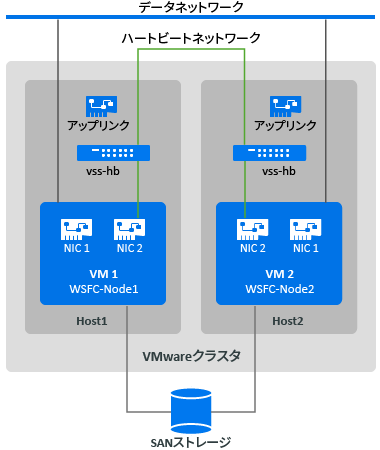 Windowsクラスタ用のVMノードには、ハートビートを相互に通信するため、VMware環境内にハートビートネットワークが必要です。各ターゲットVMの2つ目のNICがハートビートネットワークに属するようにします。