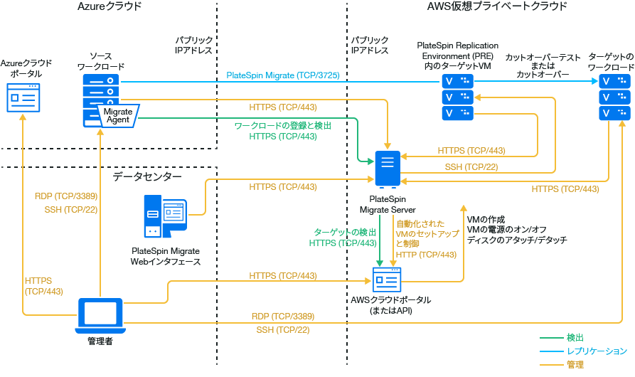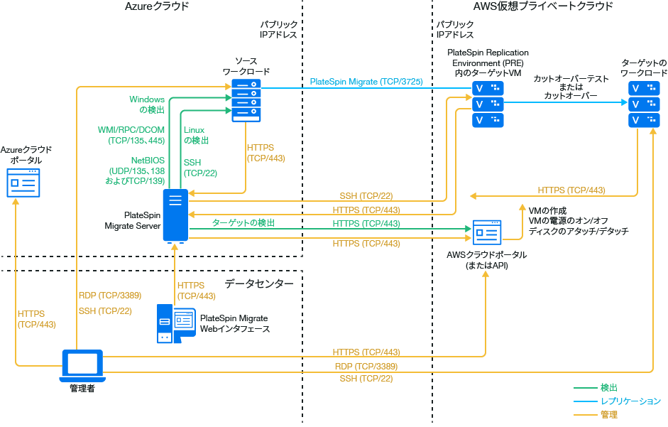 ターゲットAWS環境で、AWS MarketplaceからPlateSpin Migrate Serverを展開します。Migrate Agentで、パブリックインターネット上のセキュアな通信を使用して、ワークロードをクラウドベースのMigrateサーバに登録します。インターネットアクセスとパブリックIPアドレスは必要です。図 12-3に、AWS、Azure、データセンターマイグレーション環境のさまざまなコンポーネントの所在とそれらのコンポーネント間の通信を示します。