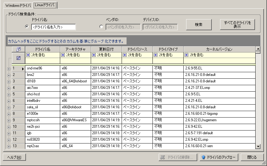 ツール>デバイスドライバの管理の順にクリックし、Linuxドライバタブを選択します。
