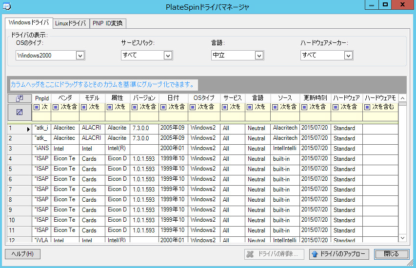 PlateSpin Driver Managerを使用して、デバイスドライバをドライバデータベースにアップロードします。