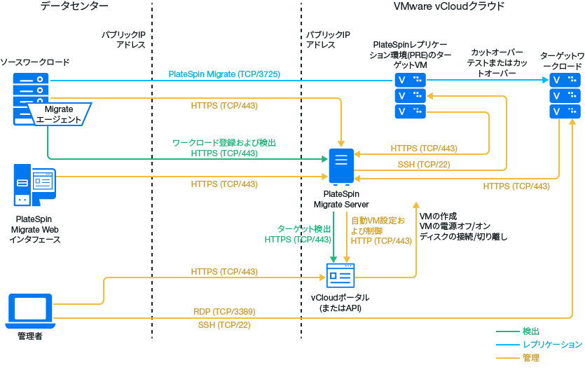 メモ:図 10-1は、自動検出およびWindowsワークロードとLinuxワークロードのネットワーク要件を示しています。別の方法として、ソースワークロード上でMigrate Agentを使用してワークロードを登録し、そのインベントリ詳細をHTTPS (TCP/443)経由でPlateSpin Migrateサーバに送信することができます。セクション 2.6.2, ワークロード登録の要件およびセクション 22.7, Migrate Agentによるワークロードの登録と詳細の検出を参照してください。