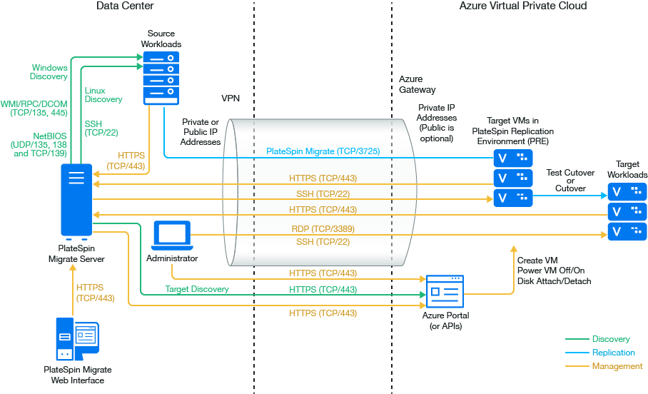 NOTE:Figure 9-1 depicts automated discovery and the network requirements for Windows and Linux workloads. You can alternatively use Migrate Agent on the source workload to register the workload and send its inventory details to PlateSpin Migrate server using HTTPS (TCP/443). See Requirements for Workload Registration and Registering Workloads and Discovering Details with Migrate Agent.