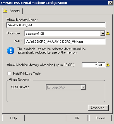 Virtual Machine Name: Specify the display name for the new virtual machine. Datastore: Select the datastore where you want to create the *.vmx file. Configuration File Path: Specify a name and the directory path for the virtual machine’s *.vmx configuration file. Virtual Machine Memory Allocation: Specify a value for the amount of virtual RAM to be assigned to the virtual machine. Install VMware Tools: Enable this option to install VMware tools during the migration process (recommended). SCSI Drives: Select either BusLogic or LSIlogic (the recommended option). Advanced: Click this button to view or modify advanced VM configuration settings. |