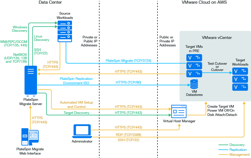 NOTE:Figure 13-1 depicts automated discovery and the network requirements for Windows and Linux workloads. You can alternatively use Migrate Agent on the source workload to register the workload and send its inventory details to PlateSpin Migrate server using HTTPS (TCP/443). For network requirements when using Migrate Agent, see Requirements for Workload Registration and Registering Workloads and Discovering Details with Migrate Agent.