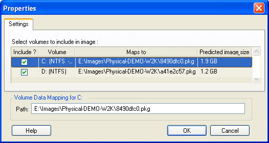 Drive Configuration: Selecione os volumes para o PlateSpin Migrate incluir na imagem e especifique o caminho para o arquivo do pacote (em Drive Configuration, clique em Volumes).