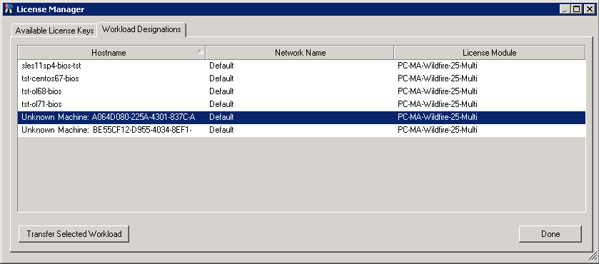 Na guia Workload Designations do Gerenciador de Licença, selecione a carga de trabalho necessária e clique em Transfer Selected Workload.