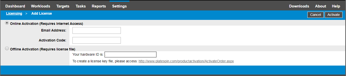 A ativação online requer acesso à Internet na Interface da Web do PlateSpin Migrate.