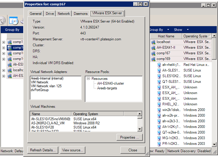 A figura a seguir mostra as propriedades de um Servidor VMware ESX descoberto.
