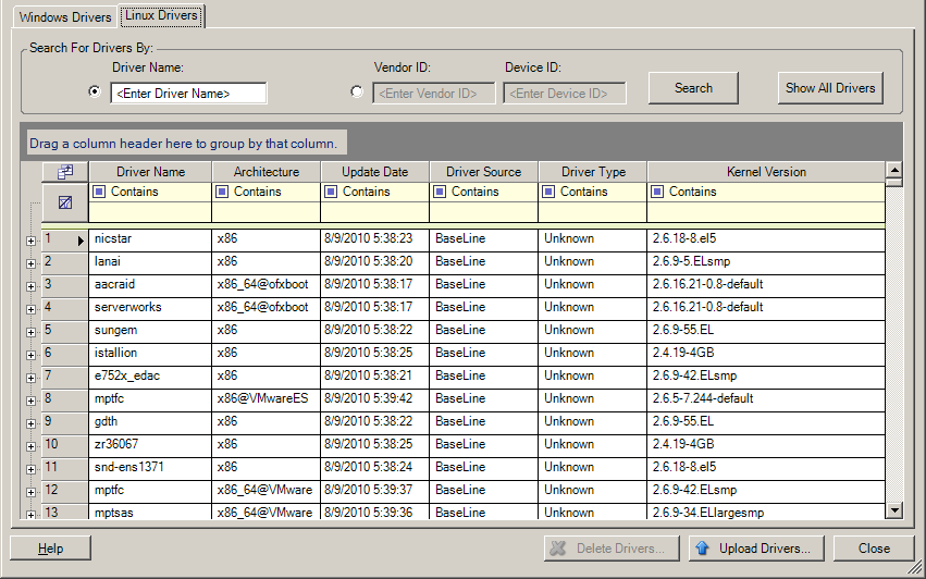 Clique em Tools > Manage Device Drivers e selecione a guia Linux Drivers:
