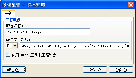 映像配置: 指定映像名称、用于储存映像的位置的路径,以及是否使用 NTFS 压缩(在“映像配置”下,单击一般)。