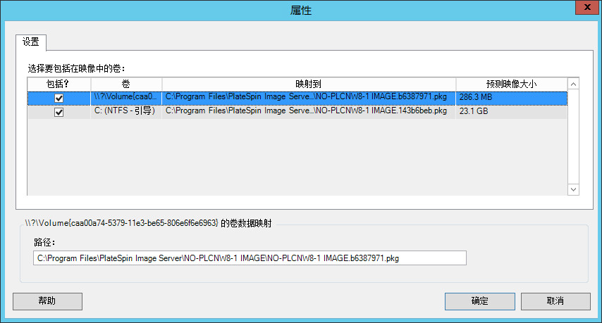 驱动器配置: 选择您要让 PlateSpin Migrate 在映像中包含的卷,并指定包文件的路径(在“驱动器配置”下,单击卷)。