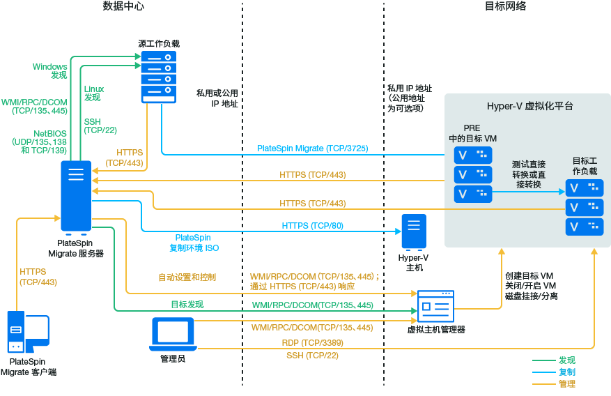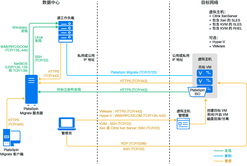 注:图 14-1 和图 14-2 描绘了 Windows 及 Linux 工作负载的自动发现和网络要求。您也可以使用源工作负载上的 Migrate 代理来注册工作负载,并使用 HTTPS (TCP/443) 将其库存细节发送到 PlateSpin Migrate 服务器。请参见部分 2.6.2, 工作负载注册的要求和部分 22.7, 使用 Migrate 代理注册工作负载并发现细节。