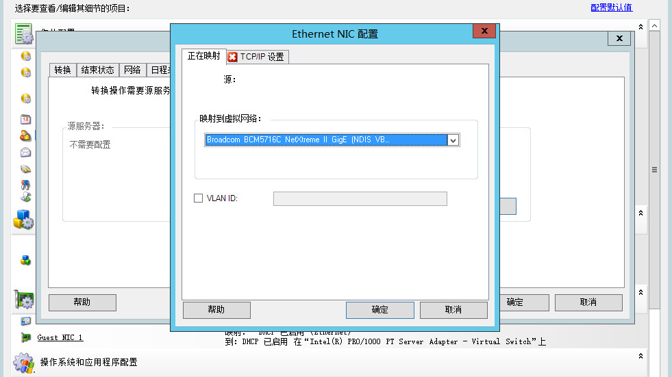 映射到虚拟网络:从该下拉列表中选择用于在脱机迁移期间进行通讯的虚拟交换器或网络。如果有多个虚拟网络适配器,请选择既可与 PlateSpin 服务器又可与源计算机通讯的适配器。此网络可以与迁移后目标虚拟机将在其中运行的网络不同。 VLAN ID:(仅适用于 Hyper-V 服务器上的目标计算机)启用此选项可指定目标计算机上要使用的虚拟网络 ID。如果不指定此 ID,默认会使用源计算机的虚拟网络 ID。 TCP/IP 设置选项卡:单击此选项卡可访问 TCP/IP 及高级网络设置。请参见TCP/IP 及高级网络设置。 |