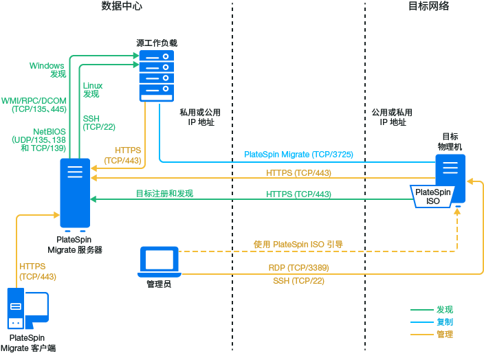 注:图 18-1 描绘了 Windows 和 Linux 工作负载的自动发现和网络要求。您也可以使用源工作负载上的 Migrate 代理来注册工作负载,并使用 HTTPS (TCP/443) 将其库存细节发送到 PlateSpin Migrate 服务器。请参见部分 2.6.2, 工作负载注册的要求和部分 22.7, 使用 Migrate 代理注册工作负载并发现细节。