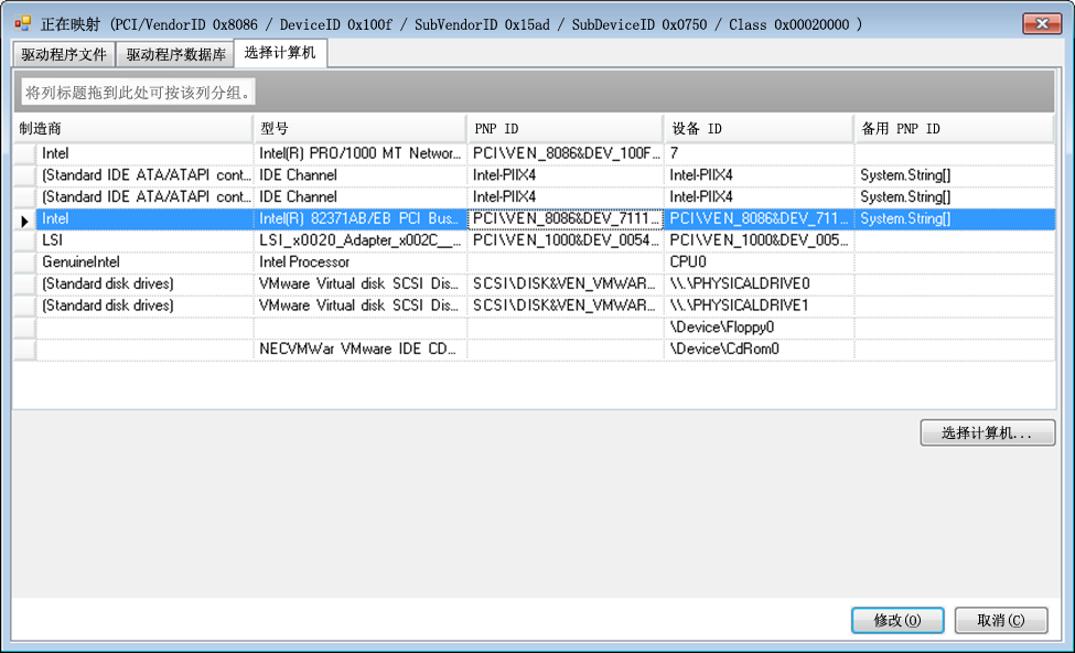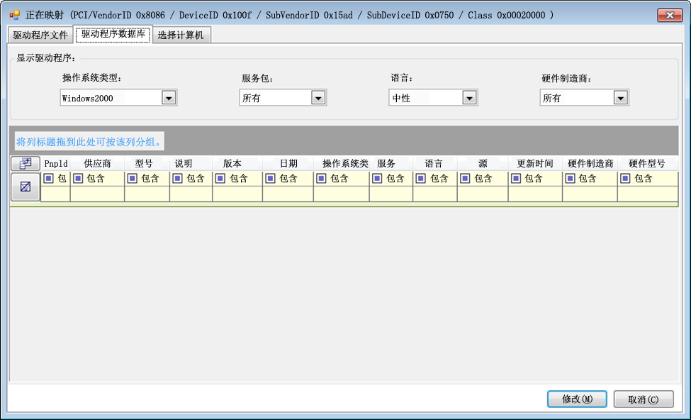 在驱动程序数据库选项卡下,浏览并选择现有驱动程序数据库,然后选择正确的 PnP ID,再选择修改。