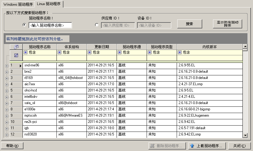 单击工具 > 管理设备驱动程序,选择 Linux 驱动程序选项卡: