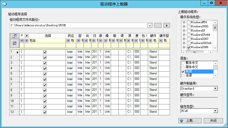 浏览到包含所需驱动程序文件的文件夹,选择合适的操作系统类型、语言和硬件制造商选项