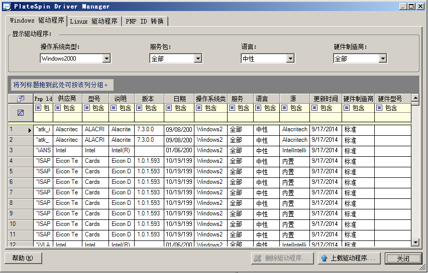 使用 PlateSpin 驱动程序管理器将设备驱动程序上载到驱动程序数据库。