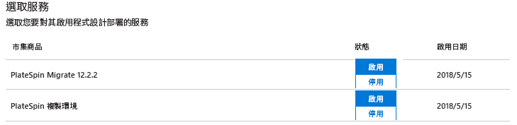 針對每個要使用 PlateSpin 執行移轉的 Azure 訂閱,在 Select Offerings (選取服務) 下,將 PlateSpin 複製環境狀態從 Disable (停用) 變更為 Enable (啟用)。