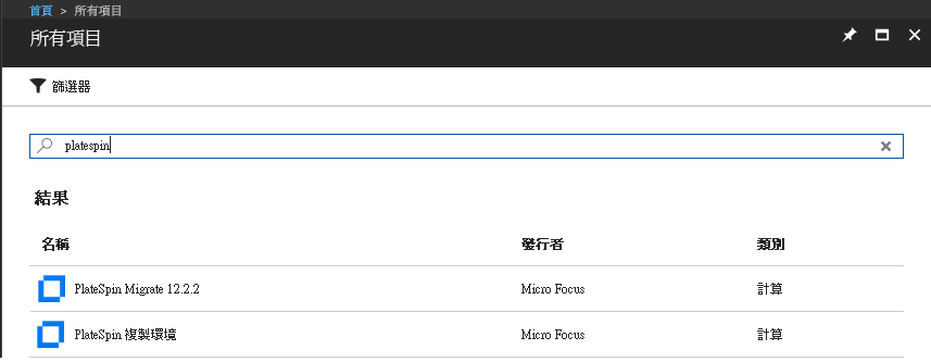 在入口網站功能表中,按一下新建,然後在 Azure Marketplace 中搜尋 PlateSpin 影像。在「所有項目」過濾器中輸入 platespin。